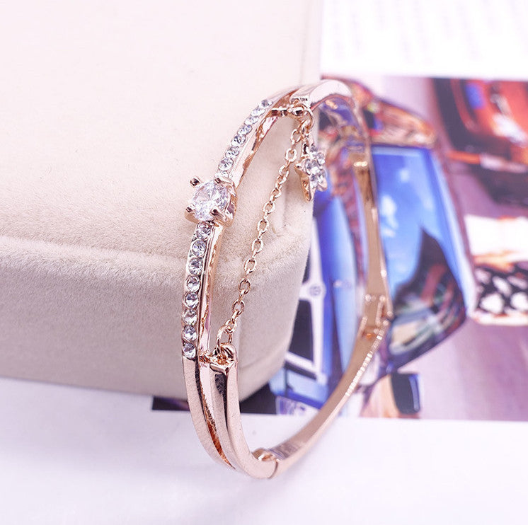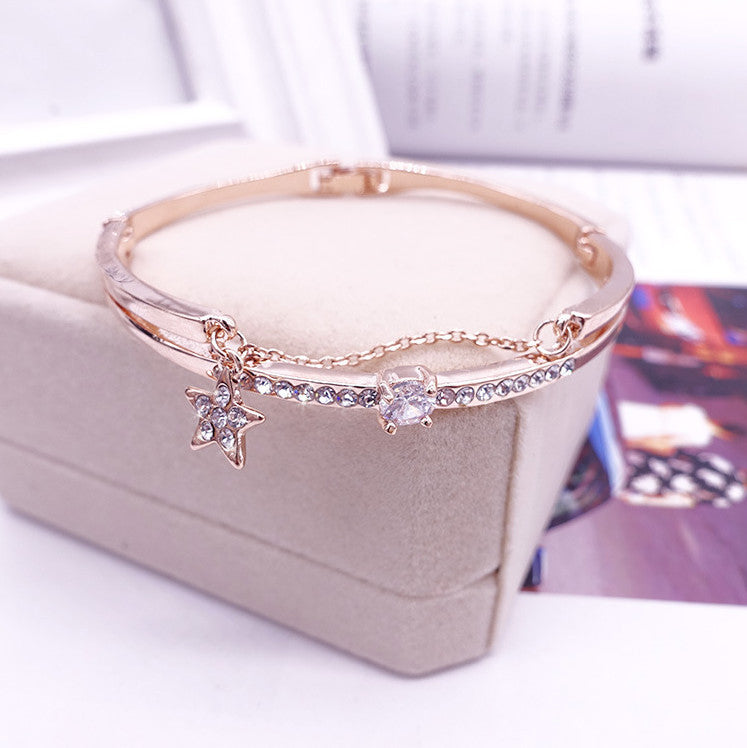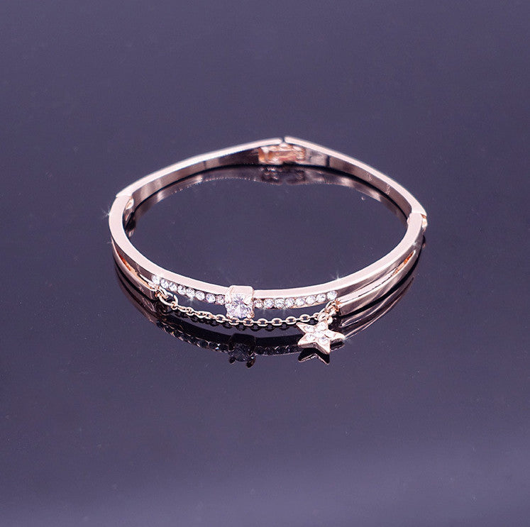 Rose Gold Star Dangle Pavé Round CZ Diamond Bangle Bracelet