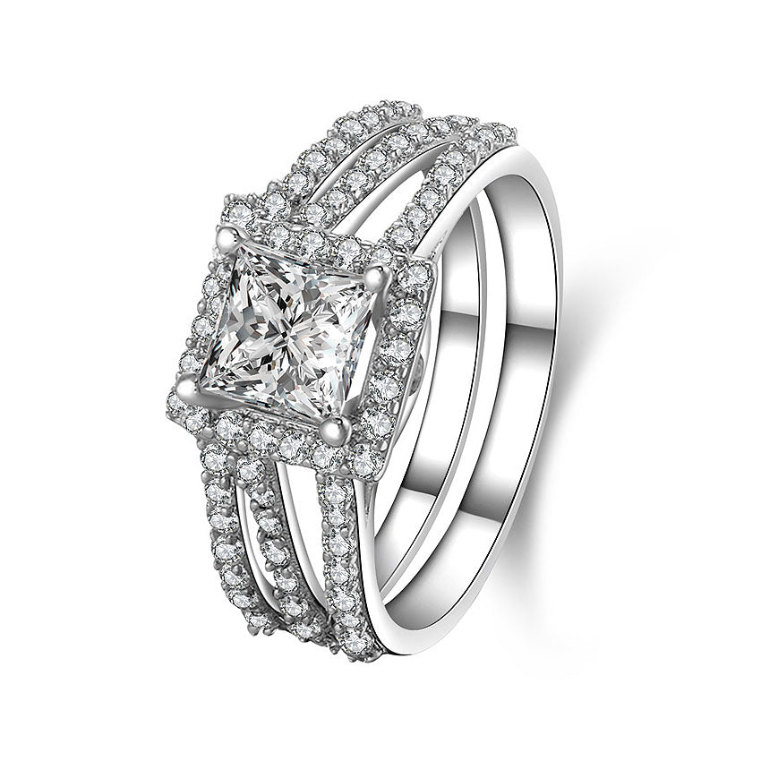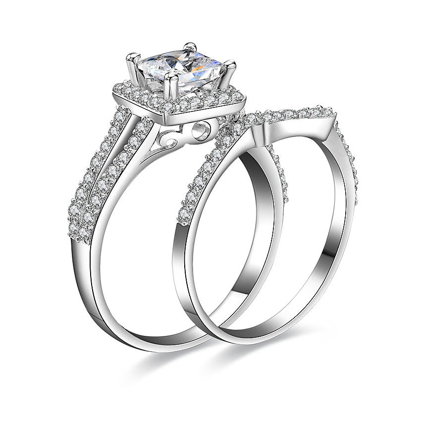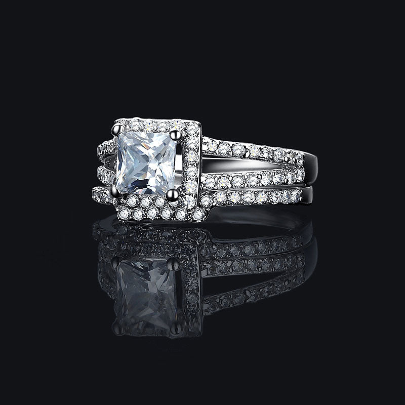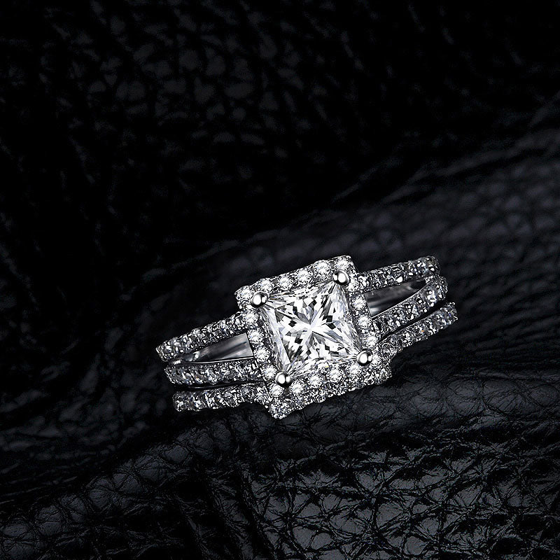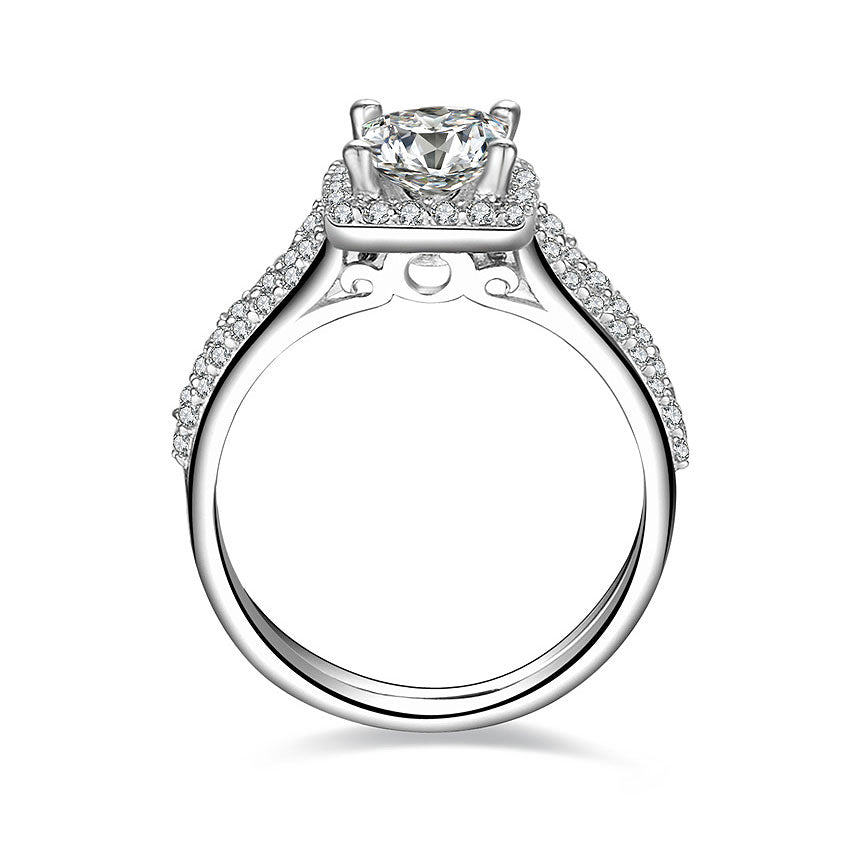 This exceptional setting features a halo of cubic zirconia diamond accents that curve gently around the center 1.0ct princess cut SONA diamond for a distinctive look. Two rows of pavé diamonds sparkle on the contemporary split shank band, and the vintage-inspired arching design under the setting are perfect finishing touches. Wear the matching wedding band for pure sophistication.