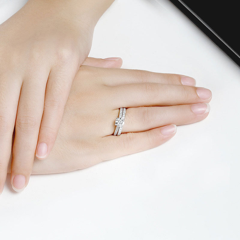 This elegant engagement ring is a classic with beautiful vintage-inspired touches. A stunning 0.75ct round cut centre SONA diamond is mounted in a solitaire cathedral setting with intricate filigree embellishment and pavé set CZ diamonds along the delicate shank. Wear it with the matching wedding band to complete this romantic and timeless look.