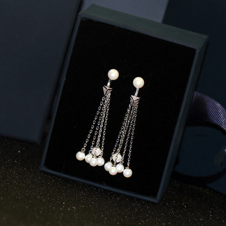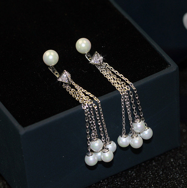 Our exceptional pearl dangling sterling silver earrings is a versatile jewelry that can be wear from day to night. Each earring features a pyramid encrusted with sparkling cubic zirconia diamonds and 5 long chains with dangling pearl bottom. This alluring pearl earring will definitely add class to your look.