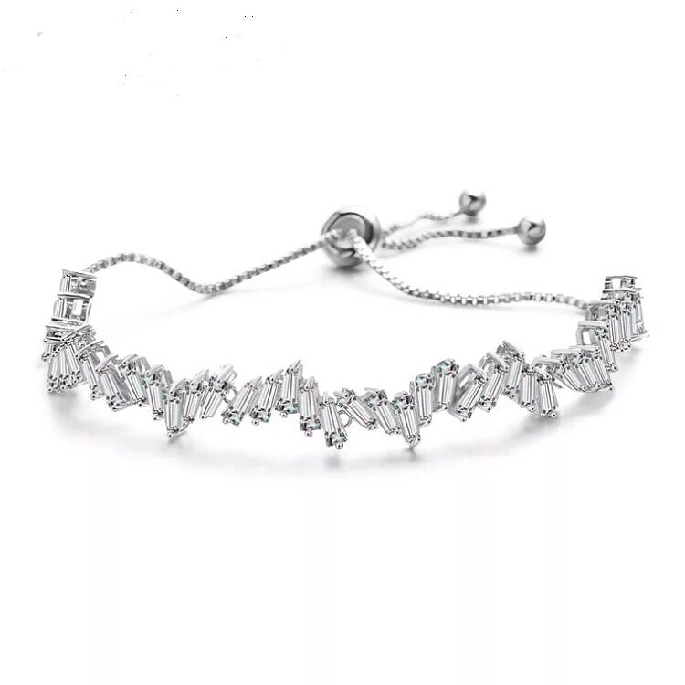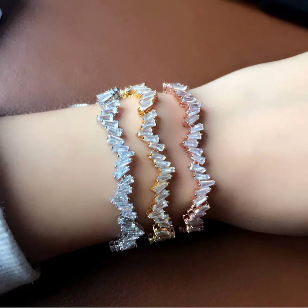 This beautiful bracelet features a unique staggering design of sparkling white sapphire in baguette cut. Comes in silver, gold and rose gold, choose the colour that fits you the best. It also has an adjustable function making this an excellent gift.