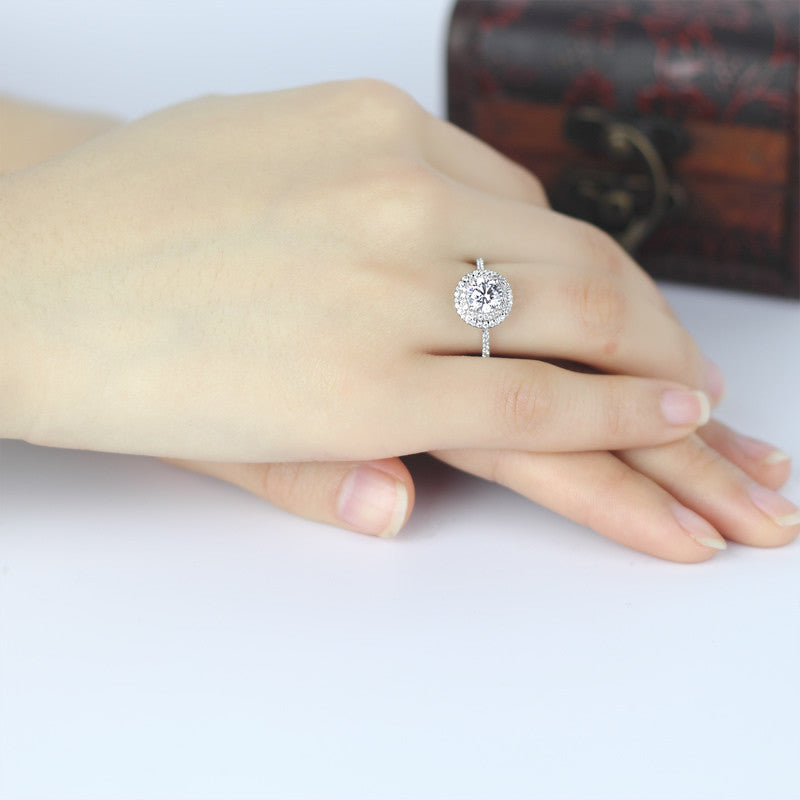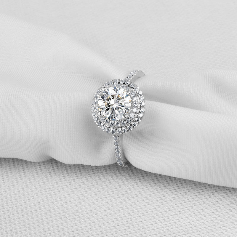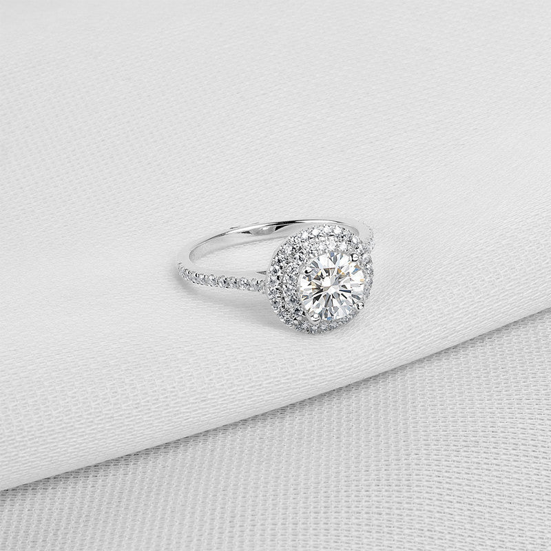 This is what she's been waiting for. Capture her heart with this stunning 1.0 carat centred round cut SONA diamond, framed by two sparkling halos and accented with pavé-set stones along the shank that offers extra sparkle.