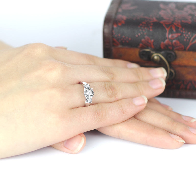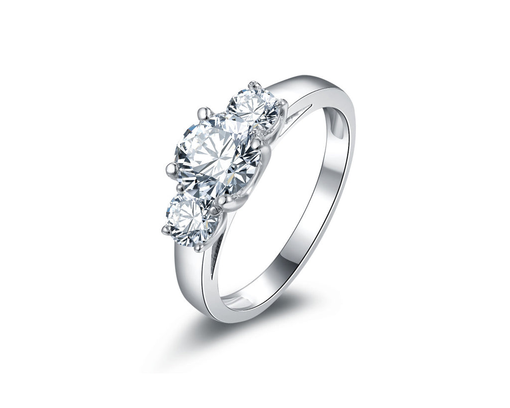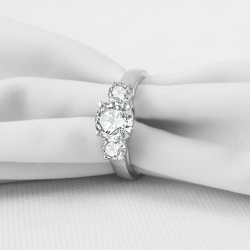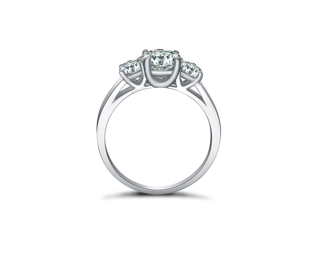 This romantic engagement ring is sculptured with three beautiful SONA diamonds. Featuring a 1.0ct. round cut stone at its centre, its claw prong design gently hugs one 0.25ct. round cut SONA diamond on each side to create an elegant and timeless look.