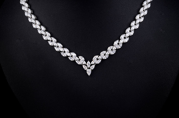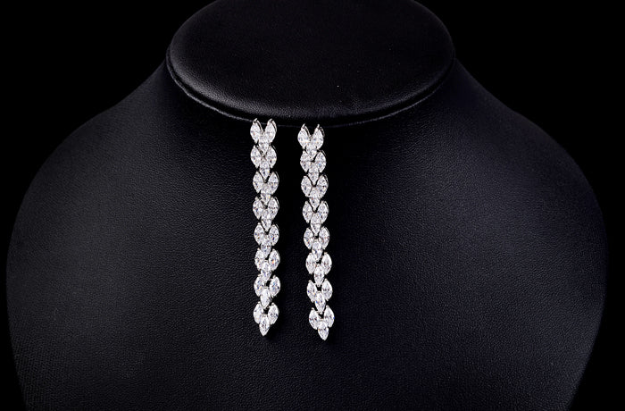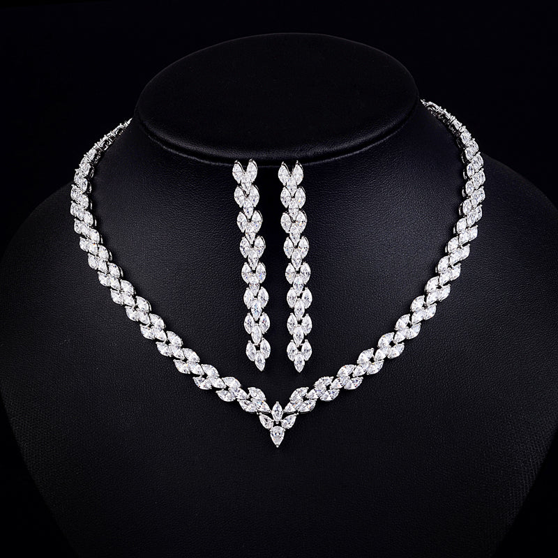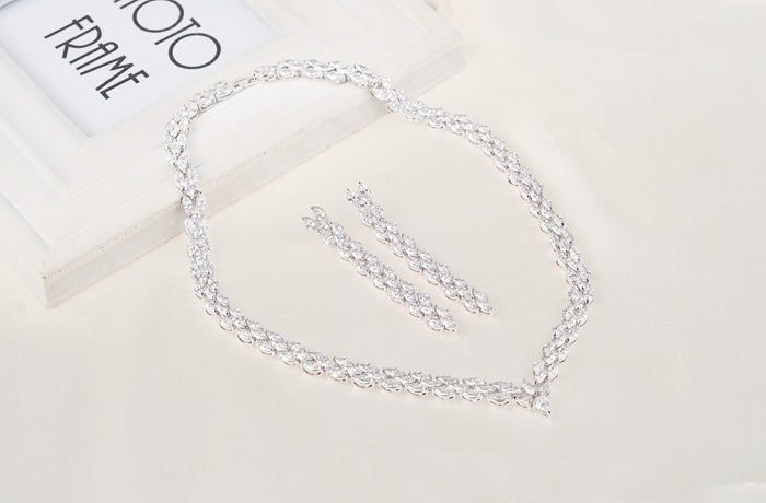 Enhance your natural beauty with this simple and elegant bridal necklace and earrings set. Crafted with three rows of Marquise cubic zirconia diamonds, this beautiful jewelry set is modern and graceful, and a perfect addition to your wedding day.